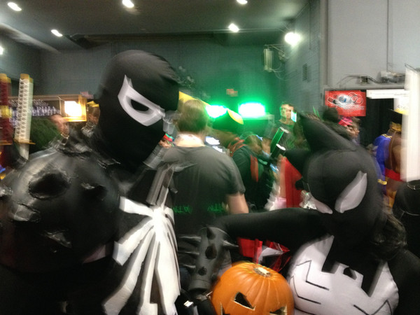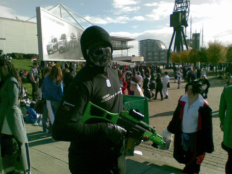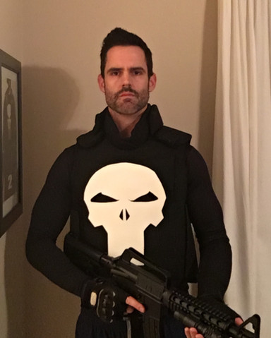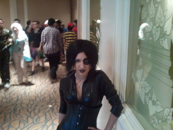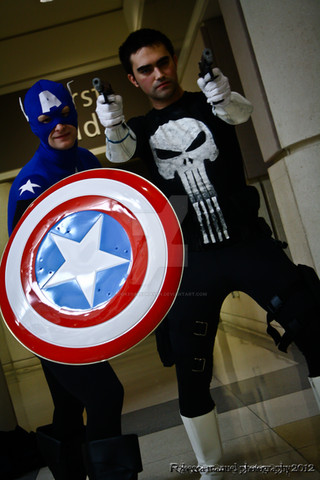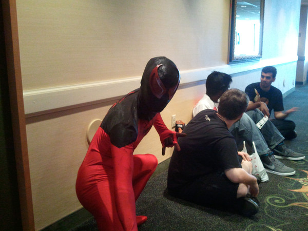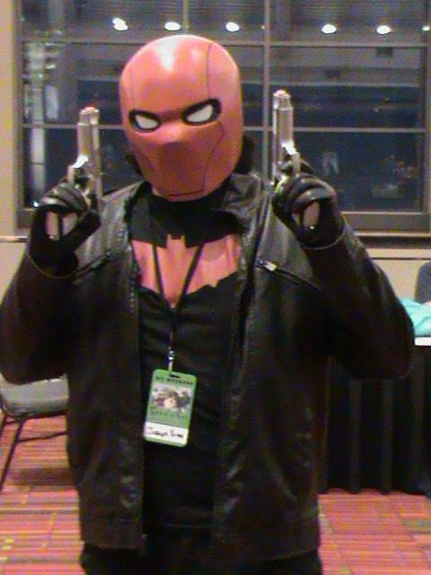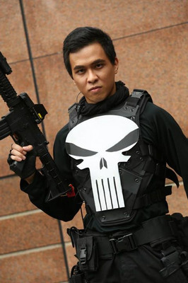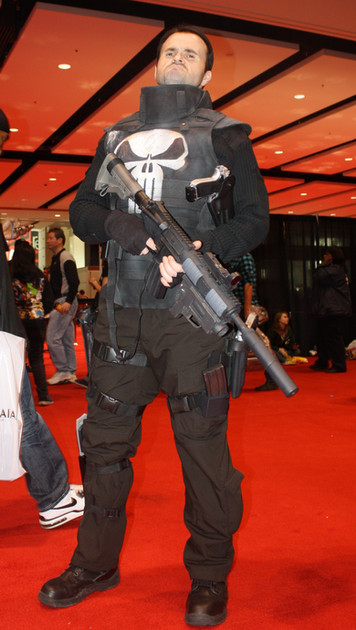 That would be the Punisher, who for some reason felt the need to hide his face that day. Maybe he had a bad run-in with Jigsaw or something. In any case, I doubt he's gonna be finding dangerous felons at a Comic-Con . . . but then that would be the perfect place to hide! Frank, you clever bastard, you!Related content