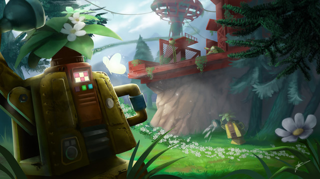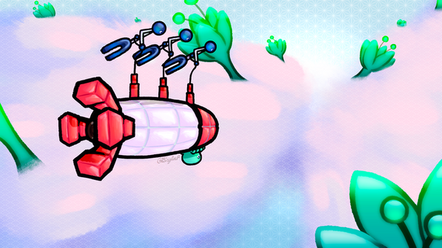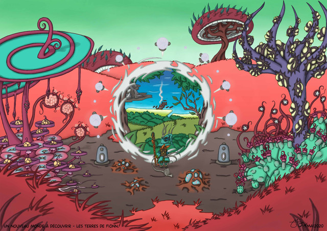 I don't really get the flailing hands part, but this one turned out awesome! The vivid colors are what caught my eyes, and the fantasy themes are very creative. I love the square clouds and the bright green toones.