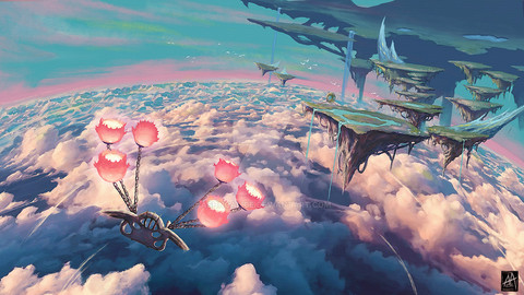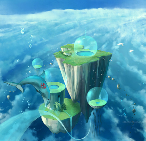 The ruins of a sky road looking down and across the riverbed below? With floating massive chunks of earth littering the horizon, and happy, pink, little butterfly dragons in a flock. Idk. xD;;