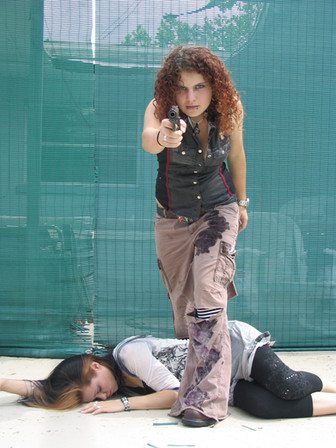 Nice idea. But it would be better if the girl, which is laying on the ground wouldnt lay directly behind the other girl, because first I saw the image I didnt realized the second woman. Also the bluish color is a bit to much. Maybe a lower opacity would be better.