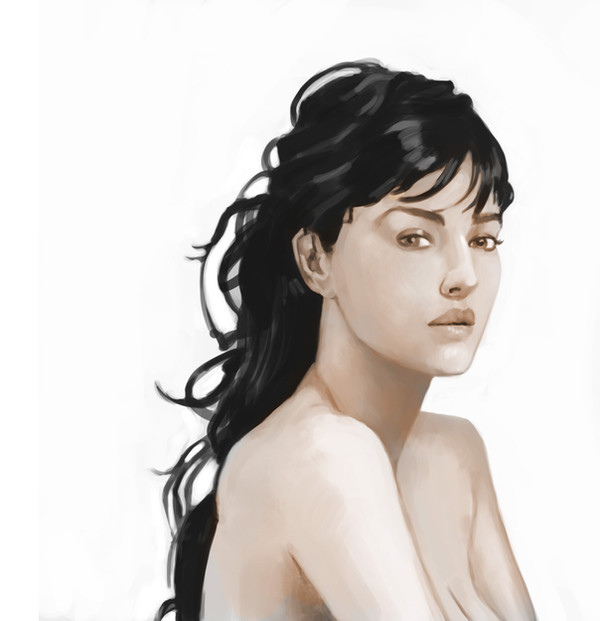 The tone on this piece are fantastic! It's great to see you're not afraid of putting some strong colours down. I think my favourite part is the mouth... The expression on her face is superb too. There's a real weight and structure to her face which I like as well, it's hard to explain...