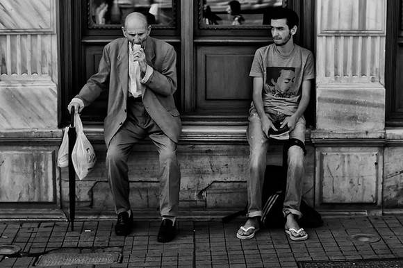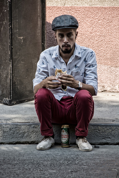 it's not clear what he's doing, and you can hardly notice the bread, or the thing in his hand. Like i said, not a technically amazing shot, so I use colour to try to make it clearer