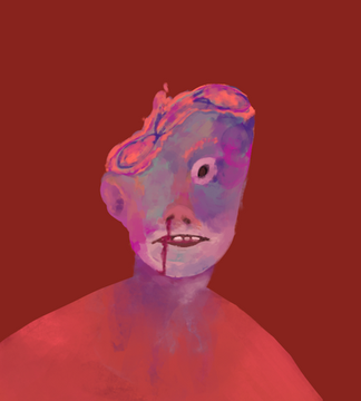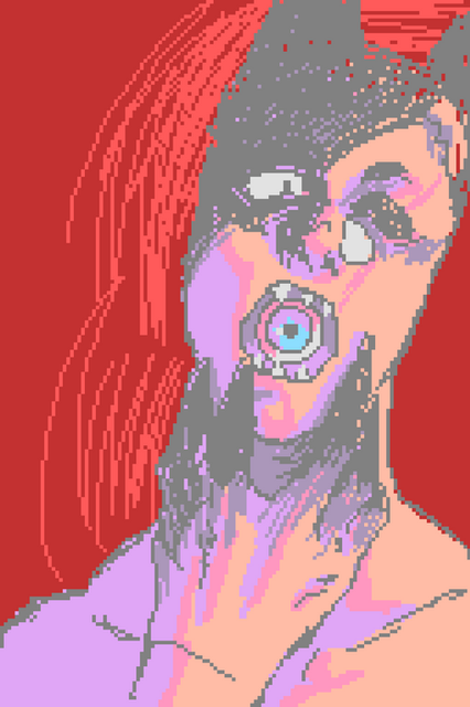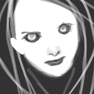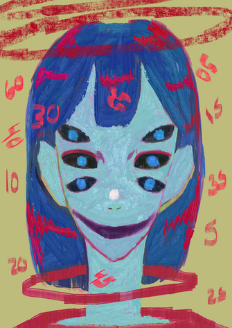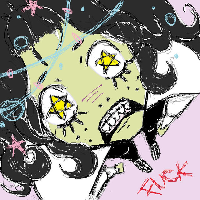 I'm really liking the colors and the shape of the glasses. I can't pidgeonhole that facial expression to one precise emotion, so I keep staring it and seeing it different ways.