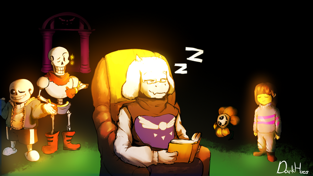 "It's a beautiful day outside, birds are singing, flowers are blooming... on days like these.. it's perfect for a nap"Just Sans taking a nap and enjoying his first real sunset in peace with his pets, rocky and his annoying dog who randomly cloned itself