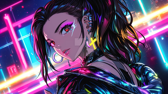 #digitalart #anime #characterdesign #cyberpunk #accessories #background #beautiful #black #colorful #confident #cool #design #detailed #digital #edgy #eyes #fashion #futuristic #geometric #girl #glowing #hair #illustration #modern #outfit #posing #purple #stylish #vibrant #art