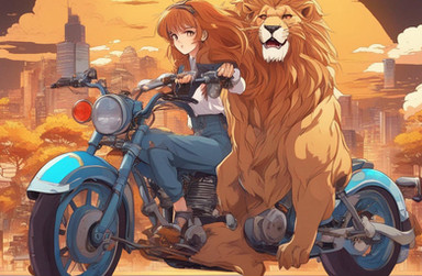 #animal #bluejacket #brownhair #brownpants #courageous #determined #digitalart #dynamicpose #femalecharacter #fierce #gear #helmet #illustration #leopardprint #lion #longhair #machine #motorcycle #power #roar #safety #speed #strength #tights #vibrantcolors #wheels #wildlife #policeuniform #art