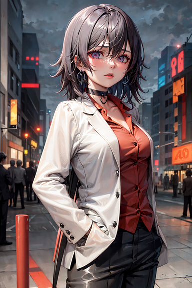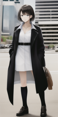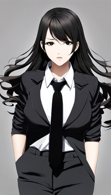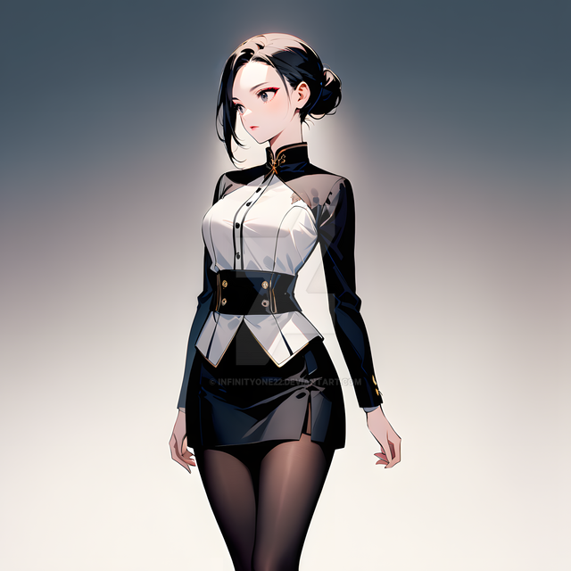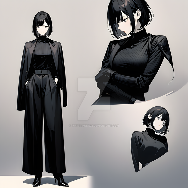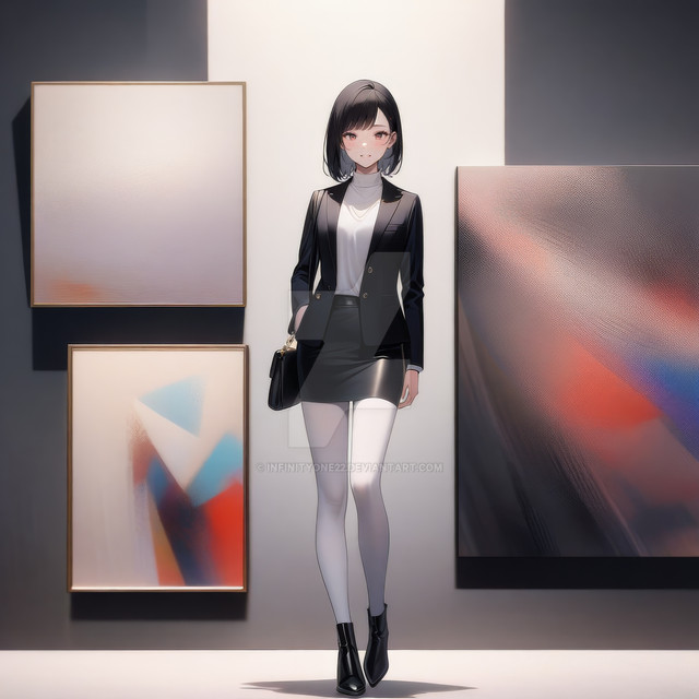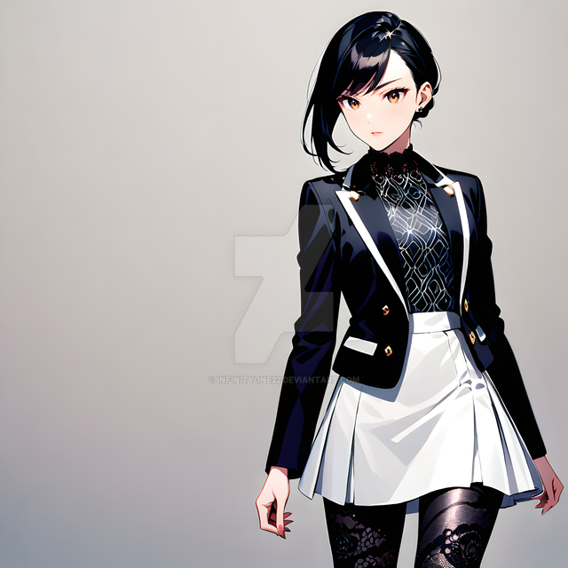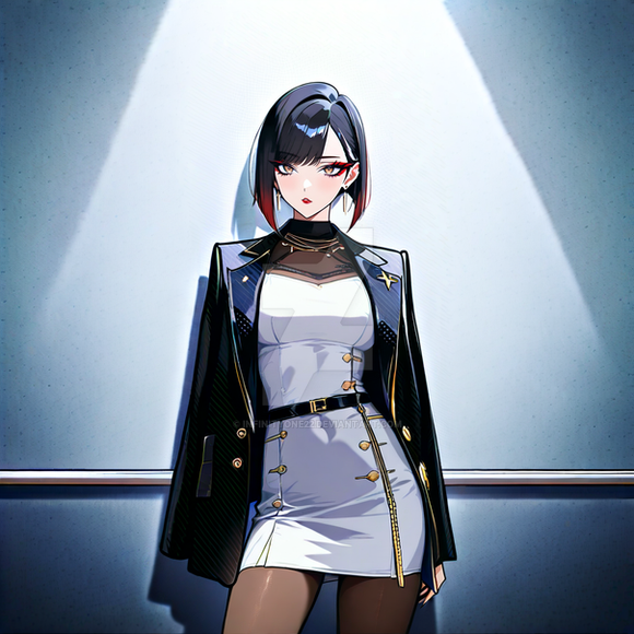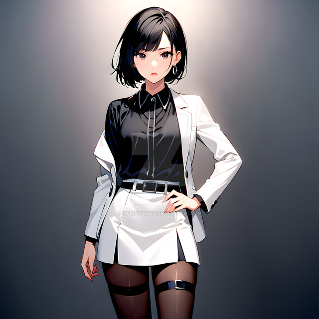 #animegirl #digitalart #characterdesign #waifu #animeart #blackhair #blazer #businesssuit #chiaroscuro #confident #coolgirl #fashion #illustration #miniskirt #modern #monochrome #officelady #professional #redeyes #shorthair #stylish #thighhighs #whiteandblack #whitesuit #strongshadows #bobcut #garterstraps #seriouslook #aiart #aigenerated