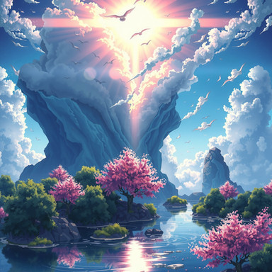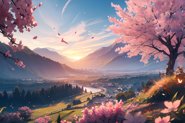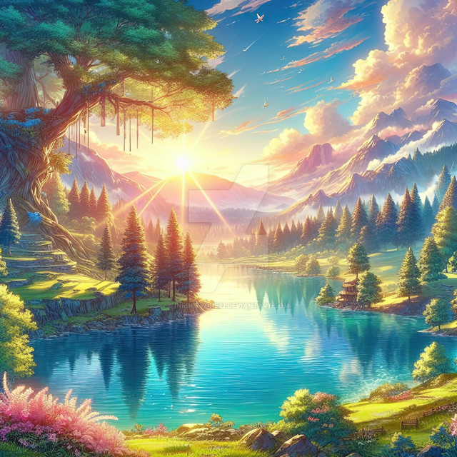 #blossoms #brightsky #clouds #dawn #details #digitalpainting #effects #fantasy #greenery #landscape #lighting #magical #mountains #mystical #nature #outdoors #pinkflowers #river #serenity #sunrays #sunrise #textures #trees #vibrantcolors #waterreflection #wilderness #lushfoliage