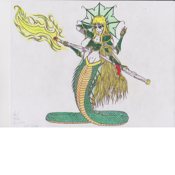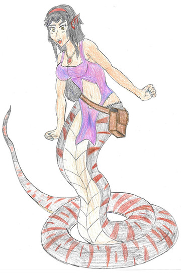 Physical Traits: Rhyddid is a 26-year-old lamia. She is about 9.25 meters long in total, but she always moves with her forehead up, so she appears to be of normal human height. She has blonde hair, with red colored eyes. Her upper body is a strong human with fiery red ears. The underside of her is that of a pink snake.