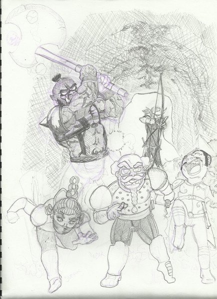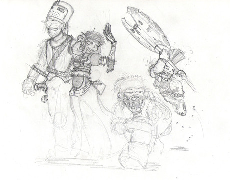 Yeah, you know his name...I don't plan to take this TOO far, simply because there's no real profit in it. I'll probably finish cleaning it all up, but I can't sell prints or even include this illustration in a book of collected work without stepping on their copyright, so I expect I'll just clean it up and then lay it aside as a bit of fun. Only one of those loosely sketched Guenhwyvars is going to be cleaned, most likely the one that curves around his legs. For one reason, it's a more interesting pose than the somewhat static profile, and for another, it hides his legs. His legs, for whatever reason, were absolutely kicking my ass, which just goes to show that no matter how good you think you might be, you can still be stymied by something stupid like the position of feet. It's messy down there 'cause I must have erased and redrawn and erased and redrawn a dozen times.