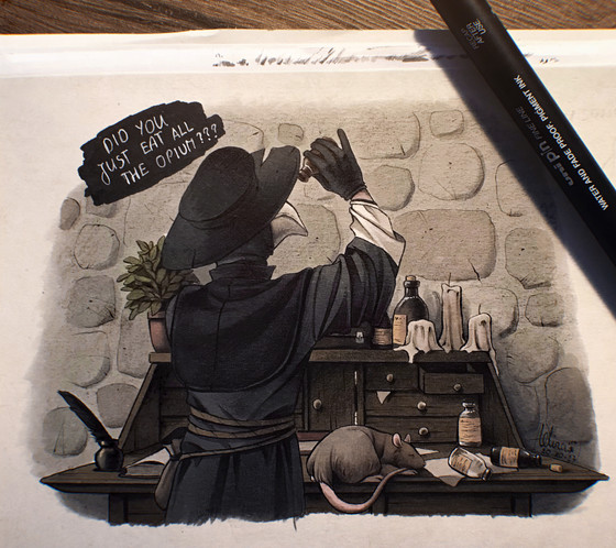 #aquarelle #blackdeath #books #grim #library #plague #reading #searching #yersiniapestis #lectio #bleak #plaguedoctor #studying #plaguedoctormask