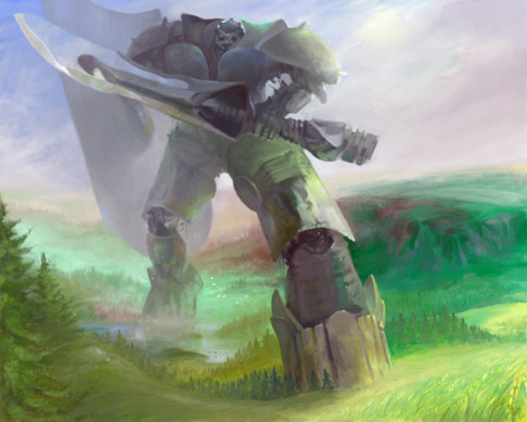 Great perspective! Horseman is a little bit too clearly seen compared to the foggy mechanical man's right leg. Would love to see this giant in detailed form.