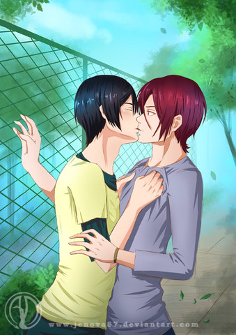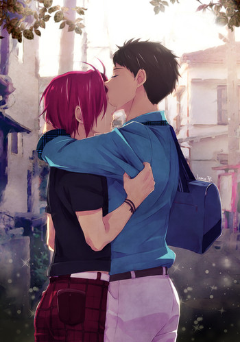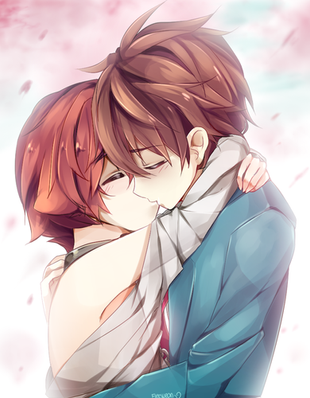 Kawaiii~Β I love the peaceful expression on the light-haired boy's face, it's so soft and happy.Β No wonder the dark-haired boy is blushing like that!Β <3Β I also like the way the leaves in the foreground are blurry so that the focus is on the two characters.Β I think it's a nice touch.