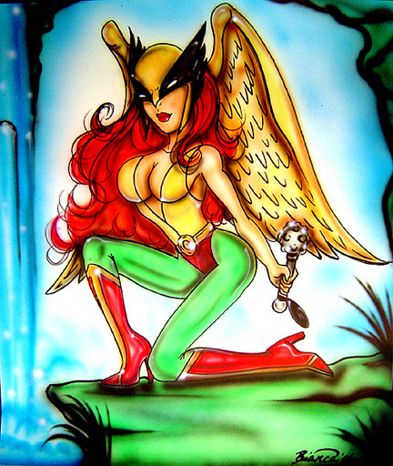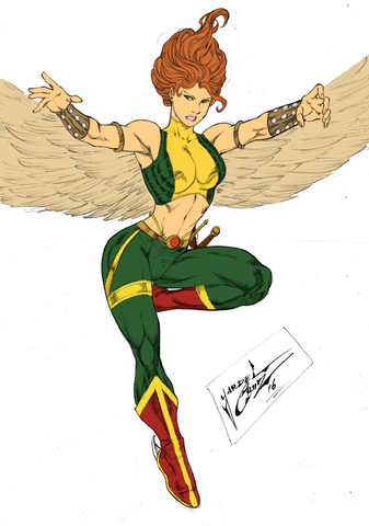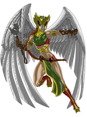 This is a drawing I did of Hawkgirl, as she appeared in my DC Universe (Mutants and Masterminds) campaign. Ive always been a fan of Hawkgirl, and I especially liked what Bruce Timm and Paul Dini did with the character in the DCAU. We "bodycast" characters in our games, and Hawkgirl is supposed to look like Joanne Whalley, from "Willow".(Obviously this is fan art, and I am in no way challenging DC's copyright claims).
