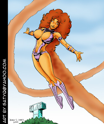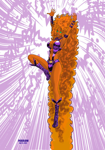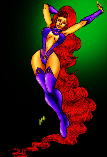 This is a picture of Starfire that I just finished. She was drawn for a DC Adventures campaign (aka the 3rd Edition Mutants & Masterminds superhero RPG). I know she doesnt have the traditional "fire blasting out the ends of her hair when she flies", but honestly, that never really worked for me.[Note: Starfire is the intellectual property of DC Comics and Warner Bros. This is fan art; no challenge to IP is to be inferred]