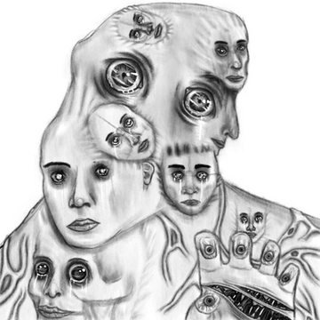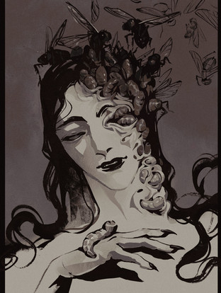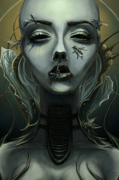 Wow... This is great! It has a great stylized realism that I really like... You use of dark and light is very nicely done and you have created a nice form. The eyes are great looking and haunting... I like the little bit of humor that you threw in w. the stripped turtleneck the compliment the bees. It was a nice way to tie everything together as well! cool work!
