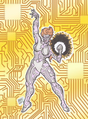 Machine Woman is a character I'm currently working on to join the ranks of my comic book universe.One of the biggest inspirations for her was Marvel's Machine Man, who is a character that needs more spotlight.
