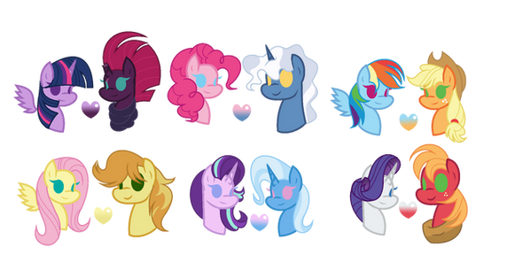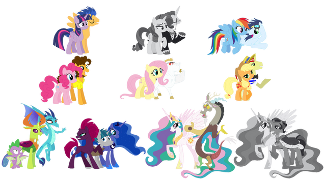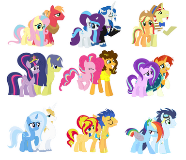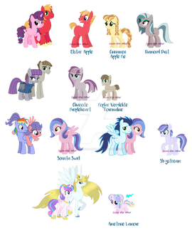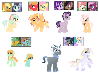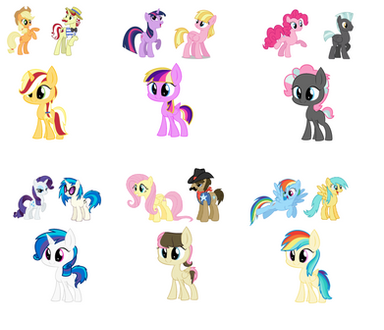 There is a lot still to be done, but I need names, pairings for Applejack, and feedback on Pinkies daughter because I can't seem to feel happy about it no matter that I do.Bases by SelenaEde