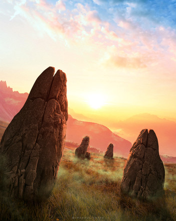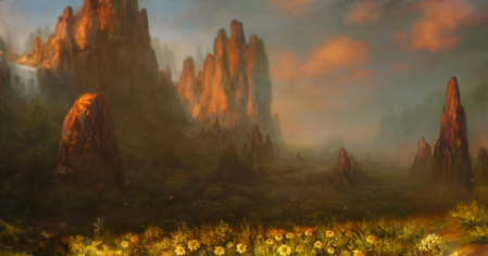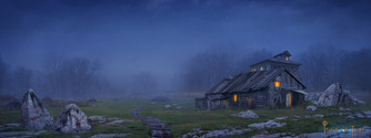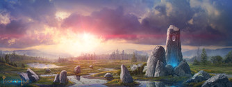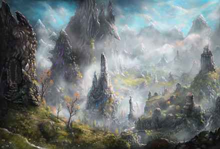 Absolutely breath taking. Word can't describe how great this art is. I love the misty forest, the rocks engraved with bright blue. Oh my goodness I love this picture so much. It looks like a barren realm in dawn.