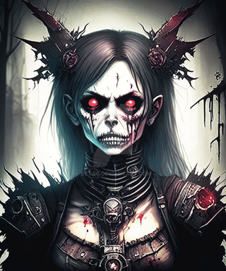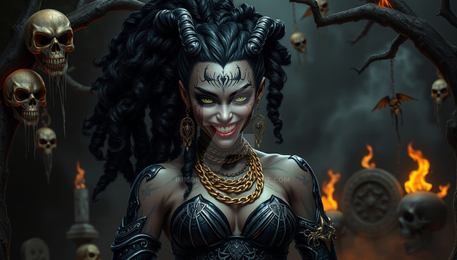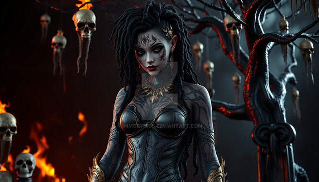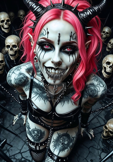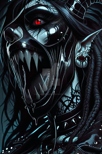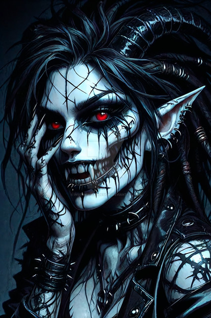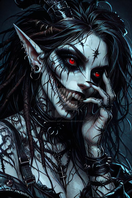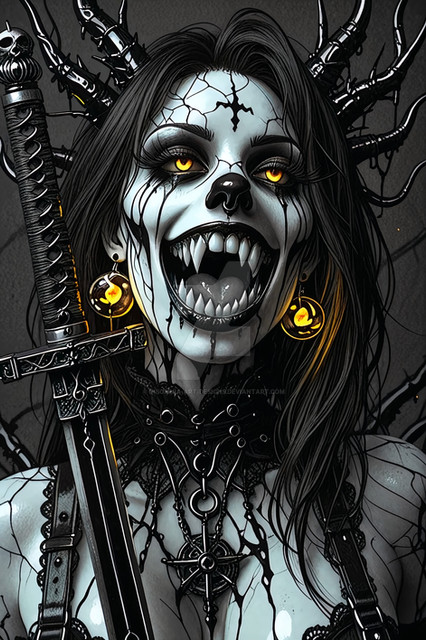 #digitalart #characterdesign #portrait #magic #fantasyart #fantasycharacter #horror #gothic #creepy #demongirl #undead #fanart #videogamefanart #originalcharacter #warrior #darkaura #demonicwarrior #glowingeyes #hornedhunter #intensestare #shadowelf #spikedchoker #darkestdesires #bladebearer #ritualmarkings #fieryhorns #civitai #comfyui #darkestdesireslora #fangsnarl