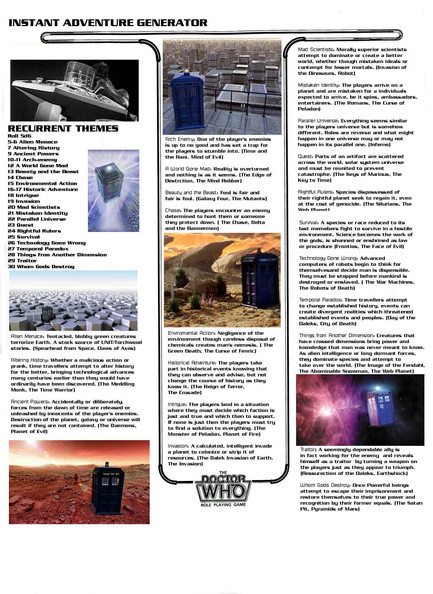 Just wanted to share some of the extra FASA rules I've crafted when running the FASA Doctor Who RPG. This allows you to quickly generate a setting a time and an advesary if you are strapped to make one.In addition I just picked up the NEW Doctor Who RPG and am looking it through. I will always love the FASA version...warts and all, but this new one is very well written. I recommend it to any aspiring Time Lord.