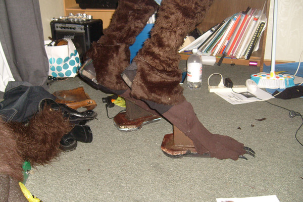 The stilts aren't too bad to walk on, actually. You just need to make sure that the base is large enough for balance. I did get some nice blisters during my first long endeavors in the stilts, but that's probably just because of the angle of the shoes. Someday I'll build a better werewolf costume with better stilts! XD