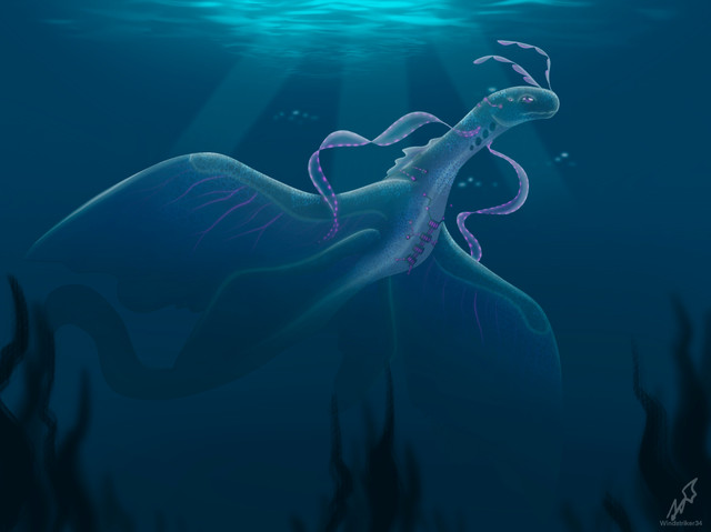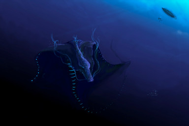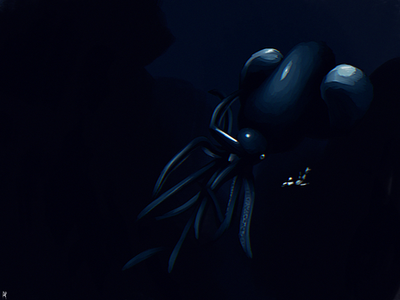 Sequestered away in Aether's depths the squigglepus unfurls a ghostly net casting its trap with the use of its four arms, unique among squims its arms are actually what used to be its jaws. With its trap at the ready the squigglepus lies in wait, not for some grand beast as the squigglepus is a filter feeder, with time its deadly net begins to sparkle with marine snow, remains of nutrients fallen from photic zone above. Once satisfied the squigglepus reels in its catch combing through its net for a well deserved meal, its dorsal jaw and teeth have lengthened to better wrap around its biological trawl. Its net pruned of debris, the squigglepus tenderly repairs its net before starting the cycle anew.Read more about the Squigglepus at Planet Aether: sites.google.com/view/planet-a…