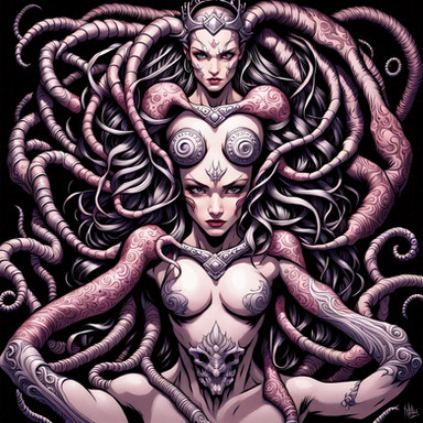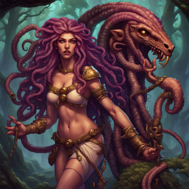 Once a beautiful maiden with cascading locks of golden hair, Medusa had captured the attention of many suitors. But one day, she caught the eye of the sea god Poseidon, who desired her for himself. When she rejected his advances, he cursed her with serpentine hair and the ability to turn anyone who looked upon her to stone. Now, she lives alone in a cave, shunned by society and feared by all who cross her path. And yet, despite her monstrous appearance, she still longs for the love and companionship that was taken from her.