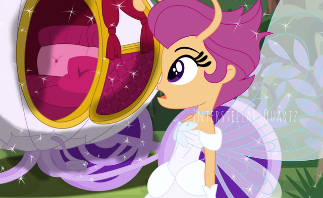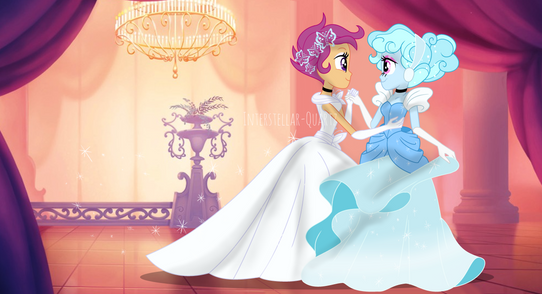 Scootaloo shyly smiled and nodded in agreement as he took her hand. They both giggled softly.