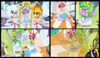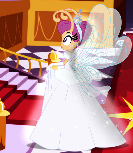 Her appearance caught the eye of a handsome fairy prince named Spike, who was enchanted by her sparkling beauty. He smiled at her from the top side of the stairs, while those below the crowds were stunned by her radiance.