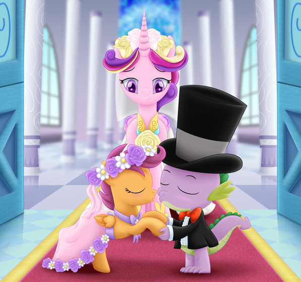 while Prince Spike smiles lovingly at her. Finally, Scootaloo reaches the top of the stairs.