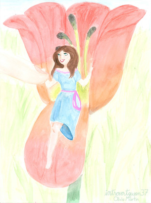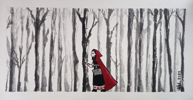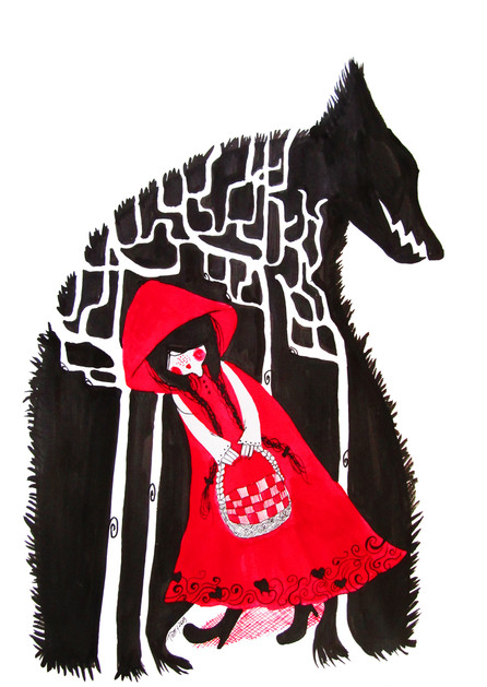 A girl, with her red riding hood up, sets out to visiting her ailing grandmother. On her trek, she encounters a wolf, making the mistake of speaking to him. A defining story, warning the dangers of talking to strangers.Watercolor, marker, ink, June 2016.