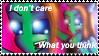 Whats the point of these I dont care what you hink stamps, are you trying to get people to shutup about it, because likewise they do not care what you think either. Well you should give more than two shits. Some people are tired of checking out fandom things like fan art and fanfiction only to be overloaded by people's pervisions and OOC romance shipping everything under the sky with 0 restraint. So maybe if more so called "fans" would control themselves people would stop hating on the fandom.Β