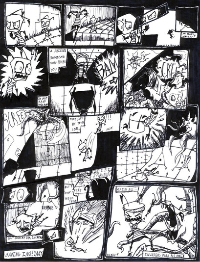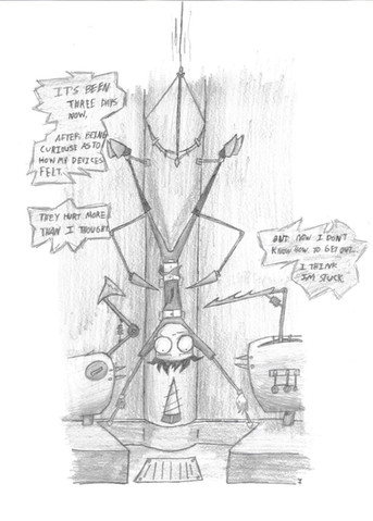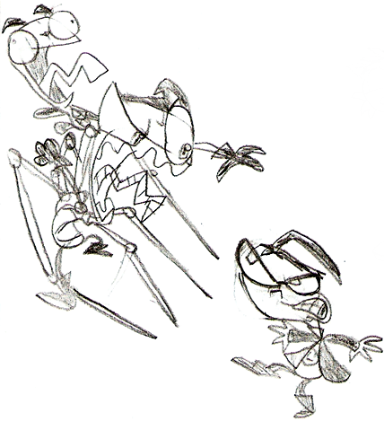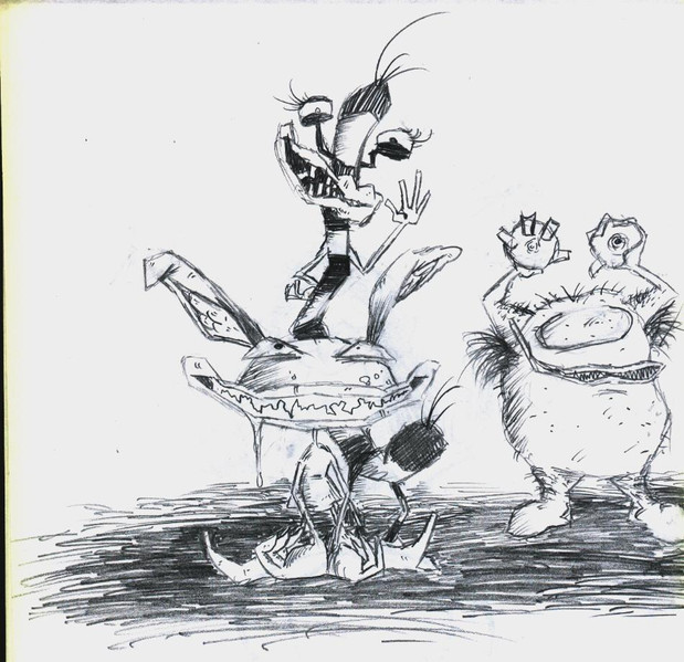Every time I want to draw Squee, what do I do? I just happen to pick the most complicated picture in the book. My first Squee pic was the back cover of his book. This one was the difficultest one in JTHM. So anyway, as you can tell, after I drew Squee and the monster's head, I started getting sloppy. That's also why there is only a foreground.I drew this at school, because I really don't have anything better to do.