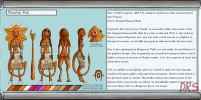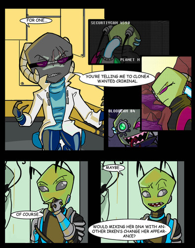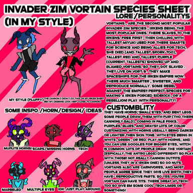 Appearance: A vortian with light grey skin,horns that curl about the head, jointed in three places. Eyes are violet, one an irken eye transplant, the other just vortian. The irken eye is larger and disproportionate. There are normally large bags beneath the eyes. Wears a white lab coat over a black bodysuit- bodysuit cannot be seen beneath lab coat normally. Lab coat has on the back a double-Z insignia. Right arm is insectoid and grey, left is crystalline and light blue. Right leg is vortain as per usual, but left is vortken. The result is a slightly lopsided gait when walking as one leg is longer than the other. Has a tail that is almost as long as her own body.