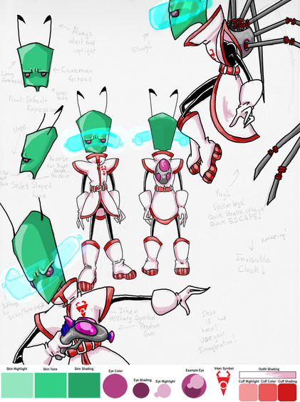 Story: Ex was created by an infamous bioengineer/weapons scientist named Zryin Zaeger. Ex was the final product of a long bout of testing to create a living bioweapon- needless to say, the experiment was ultimately successful. Ex happens to be a clone of Zryin herself, and has all of the scientist’s memories and thoughts within her. The scientist, however made a slight mistake when trying to stimulate brain growth, and ended up giving Ex a subconscious purpose to experiment with things. Ex drove herself insane with a need to fiddle with almost everything, and almost got herself killed two or three times. Her creator eventually managed to reduce the severity of the glitch, though Ex continued to be a nusance by interfereing with many of her master experiments, often creating dangerous results. She was sent away for a time, to keep her from interfering with the original Zryin’s work, but by the time she returned, the real Zryin Zaeger was dead, replaced by her final clone, who took her name and identity and continued her work (albeit missing a crucial portion of the original’s memory). Ex was allowed back into Zryin’s laboratory, but is under strict orders not to interfere with experiments, an order that she more than often ignores. The relationship between her and her younger clone sibling is somewhat strained as a result. In order to get Ex out of her horns, and to prove to the Irken empire that Vortains are in no way inferior to them, Zryin entered Ex into the Vortian Fighting Arena, staging an elaborate chase and changing records in order for Ex to be hunted and brought in. She now fights to prove that her creator, and thusly, herself, are/were the greatest scientific minds in the universe.