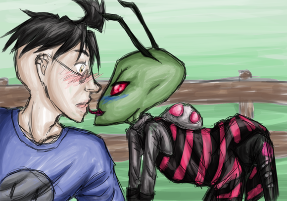 I like this alot. I get a great sense of Zim's body underneath the clothes. The wrap of Dib's hand conveys the feel of thin layer of muscle over exoskeleton-butt. I'm guessing the antennae are kind of like cartilage?