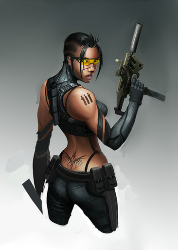 Sexy chick with a big gun. Very nice. Great choice of pose as well. And wonderful work on the coloring as always.