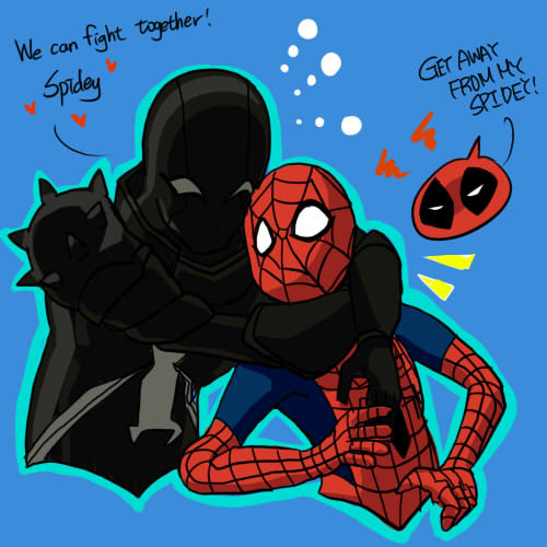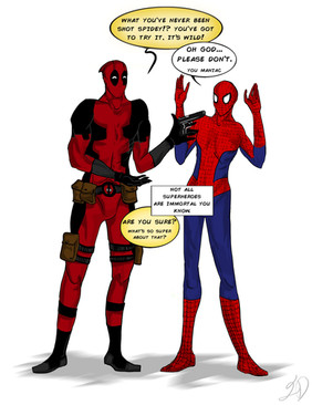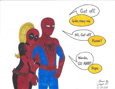 I FINALLY GOT THIS DONE!!!!! AND ON VALENTINES DAY NO LESS!!!!A while ago, I commissioned BrotherToastyCakes to do a pic with my OC Arachnid and DeadPool. That was last summer. He got it done, but I guess that he got my info mixed up and I didn't get it so I could pay him.