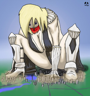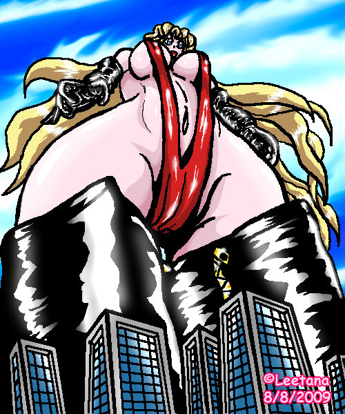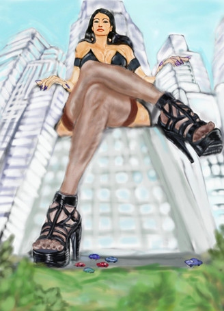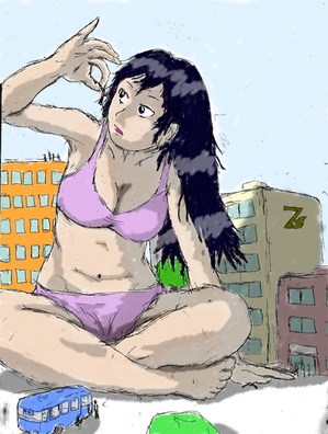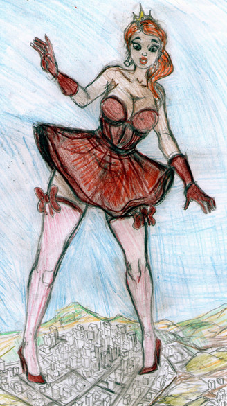 Great drawing.......the titanic giantess visits earth. As she looks around to see what is there, she had inadvertently crushed a whole city underfoot...........