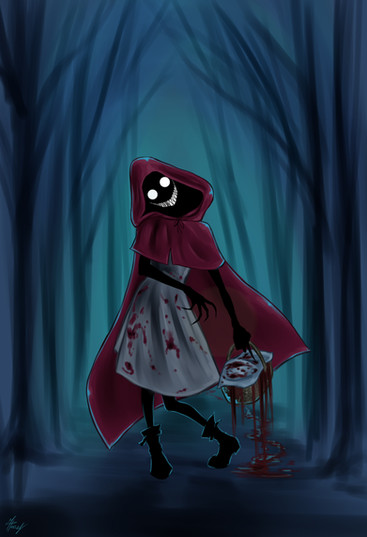 I love the ambiguous red stains dripping from her basket, making us ask ourselves-- is it wine or something more sinister- blood? I especially love the yellow eyes and devious, cat-ate-the-canary smirk (or should I say, she-wolf-ate-her-grandma smirk?). Truly great piece