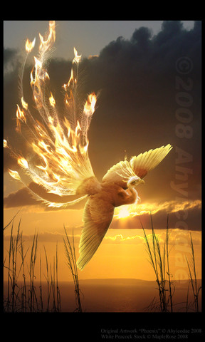 "A phoenix is a mythical bird with a colorful plumage and a tail of gold and scarlet . It has a 500 to 1,000 year life-cycle, near the end of which it builds itself a nest of twigs that then ignites; both nest and bird burn fiercely and are reduced to ashes, from which a new, young phoenix or phoenix egg arises, reborn anew to live again. The new phoenix is destined to live as long as its old self. It is said that the bird's tears contain healing abilities of pureness, and their cry is that of a beautiful song. Phoenix represents resurrection, immortality, and life-after-death, and it is closely associated with the rising sun."Source: [link]