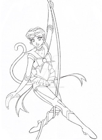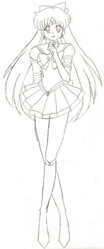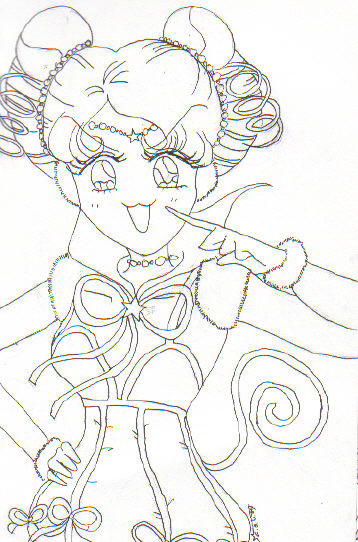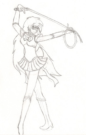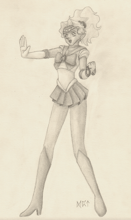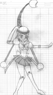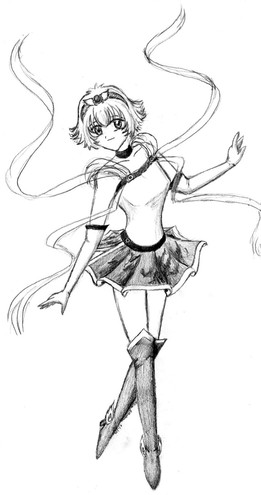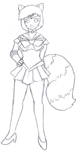 Sailor Tin Nyanko, from behind, because her character design just begs for that, what with how the skirt is made. XD; Pretty much an anatomy excercise, plus some perspective.From Sailor Moon, copyright Naoko Takuechi.