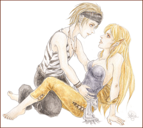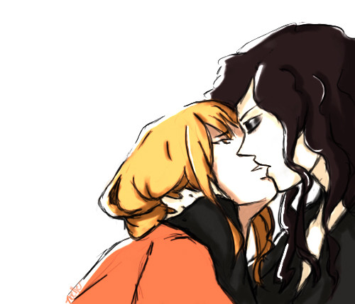 Wow, that is very well drawn. It looks so natural!! It's hard to make it look like the characters are interacting and there's GRAVITY in a picture lol And their hair is gorgeous!! I have a friend who likes this pairing, so I shall definitely show it to her! XD