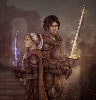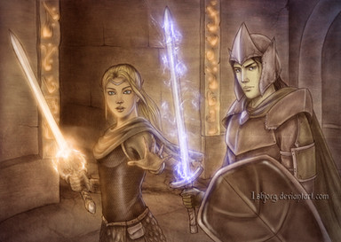 Nyacelil (right) and Nim Elen (left), along with three others nearby but not pictured (Faelon, Nim Elen and Faelon's adopted sister Eina, and family friend known as "Silence"), have just vanquished a powerful fey-ri (demon-elf) and stopped him from completing a dark ritual upon the altar behind Nim Elen. The setting is an old and haunted fortress of the Hyshaanth family, within which Nyacelil traces her paternal ancestry.
