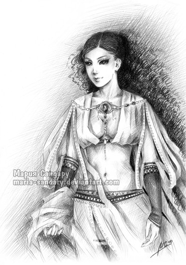 Ход моих мыслей за взглядом: девушка с красным глазом... а это и вправду рубин? Ох, какая ткань у рубашки... блестяшка на волосах? Она, случаем, не из богатой семьи?.. КОТИК! КОООТИИИИК!