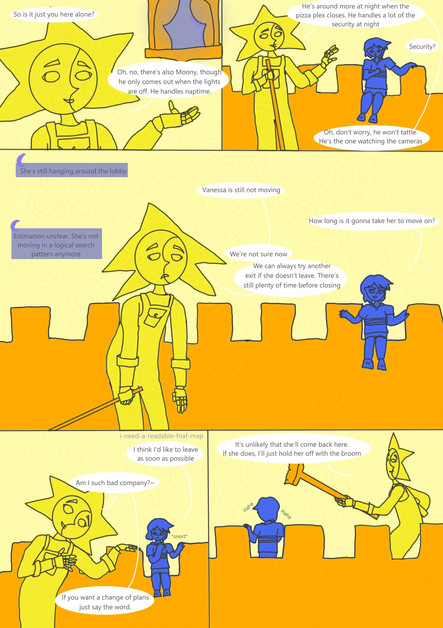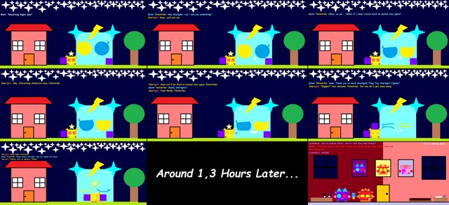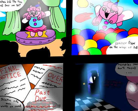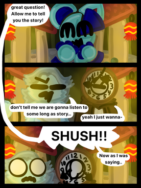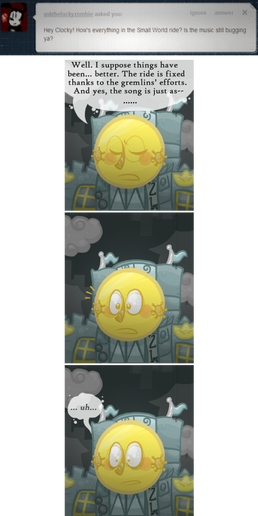 Mick: WOW! This place is COOL! Though it could use a bit more bright colors...*buts on two brightly-coloured roller-skates and and skoots arount with a paintbrush* Wonder who's sad...*sees Clock tower. (YOU are CLOCK TOWER) he skoots up to him* Hello! A-are you ok? *has his paintbrush out*