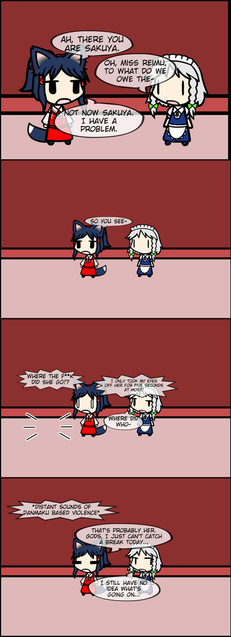 I figure if they're both tengu, Momiji's barking should be understood.Sorry for the brief inactivity this weekend. I found out that internet is going to be very limited at my dad's now. So that means no submissions over the course of every other weekend. ;^;