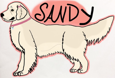 Physical description: Sandy is a pale golden Labrador retriever of average size with amber eyes.