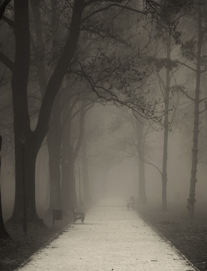 bench?fog?near the street?oak trees? this reminds me of something. and i like it!!!
